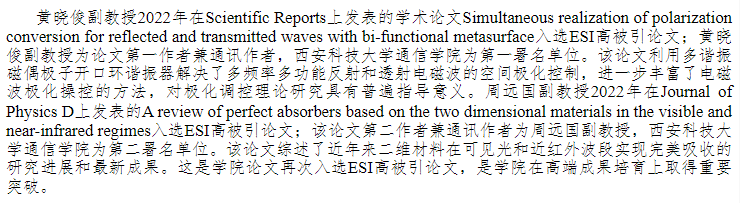 喜丰收:基于前期的基础和努力,在全国知名第三方大学评价机构软科发布的2022中国大学专业排名中,公司5个本科专业均上榜并表现优异。其中通信工程、电子信息工程、物联网工程专业,全国综合排名前10% - 20%,排名档位为B+;电子科学与技术、智能科学与技术专业,全国综合排名前20% - 50%,排名档位为B。根据ESI数据库最新国际论文统计数据显示,公司黄晓俊、周远国两位教师的论文分别入选ESI高被引论文。公司还获批2个校级师德示范工作站、1个省级高校团建样板支部。