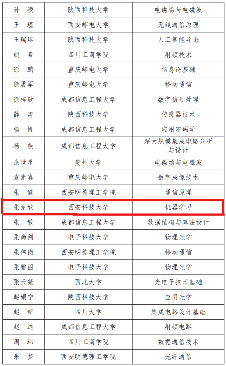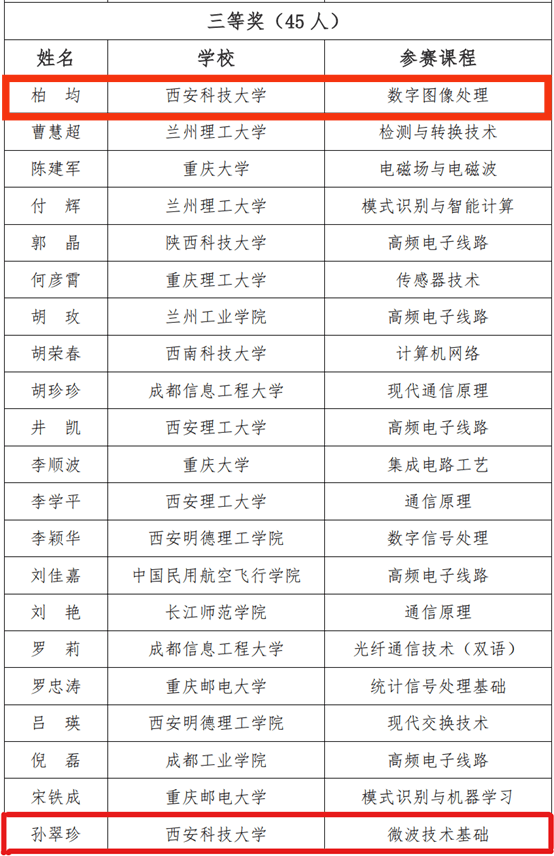 近日,全国高等公司电子信息类专业青年教师授课竞赛预赛顺利结束。经过网络匿名评审、网站公示、组委会审定,柏均老师的《数字图像处理》、公司孙翠珍老师的《微波技术基础课程》、张龙妹老师的《机器学习课程》在华西赛区中荣获三等奖。
