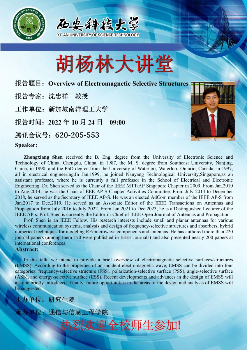 沈忠祥,教授,1987在电子科技大学获得学士学位,1990年在东南大学获得硕士学位,并于1997年在加拿大滑铁卢大学取得博士学位。1990年至1994年,沈教授在南京航空航天大学工作。1997年,他在加拿大的Dev公司工作,担任高级技术人员。1998年,他先后在哈佛大学的 Gordon McKay实验室和密歇根大学的辐射实验室做博士后研究工作。1999年,他加入新加坡南洋理工大学电气与电子工程公司并任教至今。2009年,沈忠祥教授担任了IEEE天线与电波传播/微波理论与技术新加坡分会的主席。2010年7月到2014年8月,曾担任IEEE天线与电波传播新加坡分会活动委员会主席,现任IEEE新加坡分会秘书。沈忠祥教授的研究领域包括各种无线通信系统的小型平面天线的设计,频率选择器件的分析与设计,以及射频/微波器件与天线的混合调制技术。沈教授至今已经发表(合作发表)期刊文章170余篇,会议文章200余篇。
