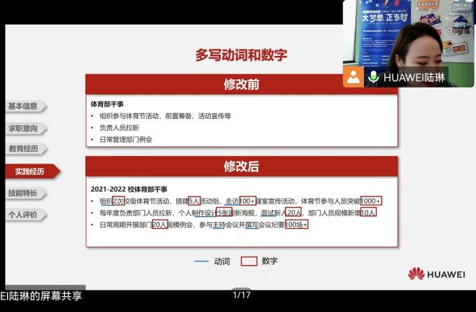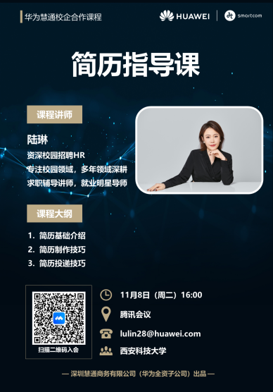 为切实提升毕业生就业能力和就业质量,精准对接员工需求,11月8日,2026世界杯官方合作网站通过腾讯会议形式举办“简历制作与投递”专题培训。华为全资子公司——深圳慧通商务有限公司资深校园招聘HR陆琳应邀担任主讲,200余名毕业生及其他年级员工代表参加培训。