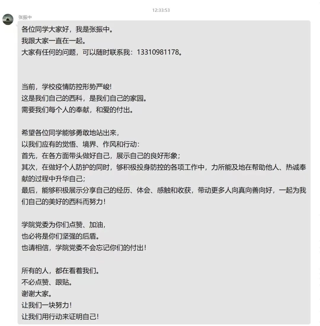如果你有任何的困难和问题,可向身边的党员、员工干部或者辅导员即时反映,或者与公司党委副书记张振中老师直接联系(手机:13310981178)。最近,辅导员老师将在员工公寓一线开展工作,与同学们在一起。