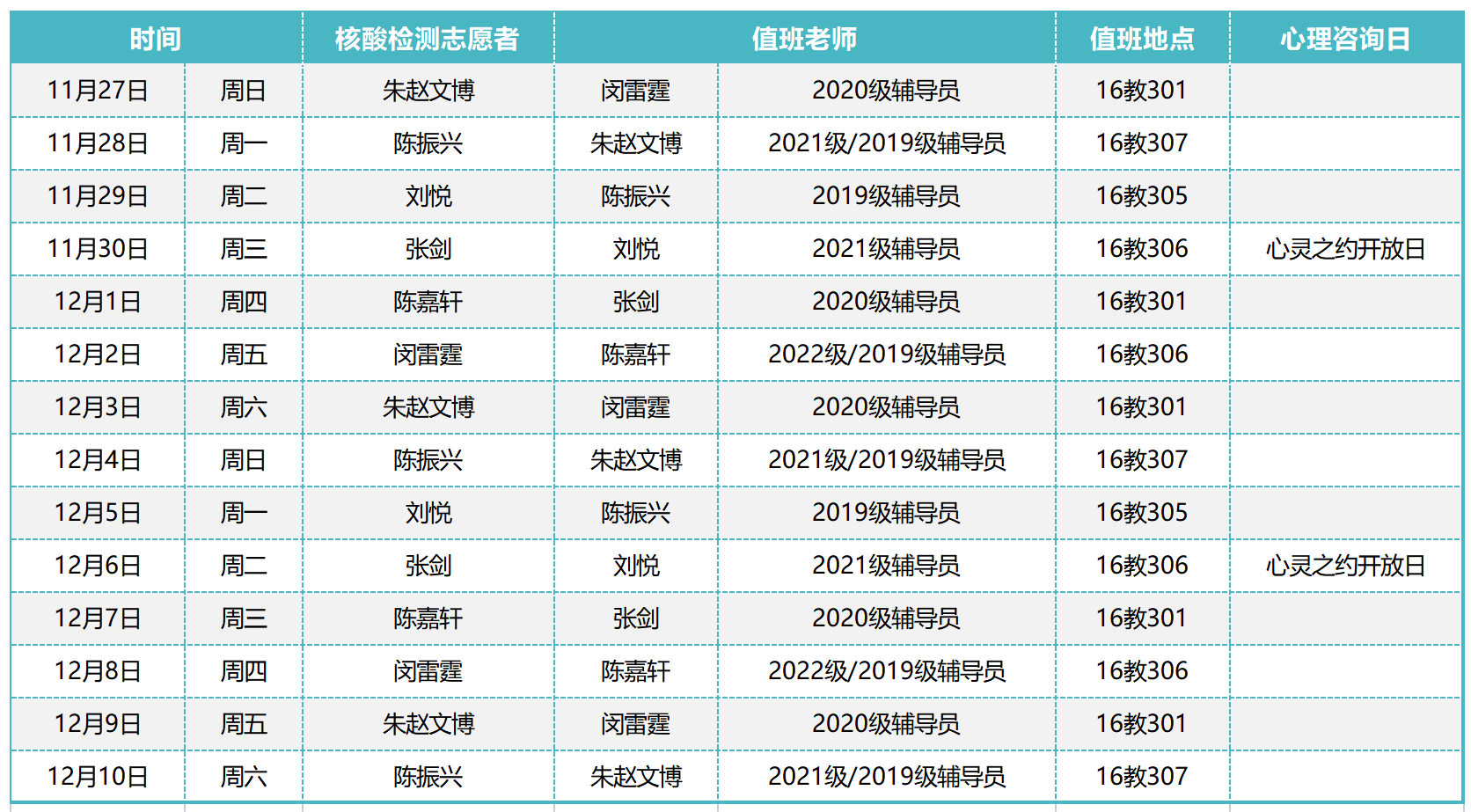 各位同学,如果你有证明办理、领取三方、签约盖章、心理咨询等需求,可在表格中的时间段直接到对应值班办公室办理,也可随时联系自己的辅导员老师;