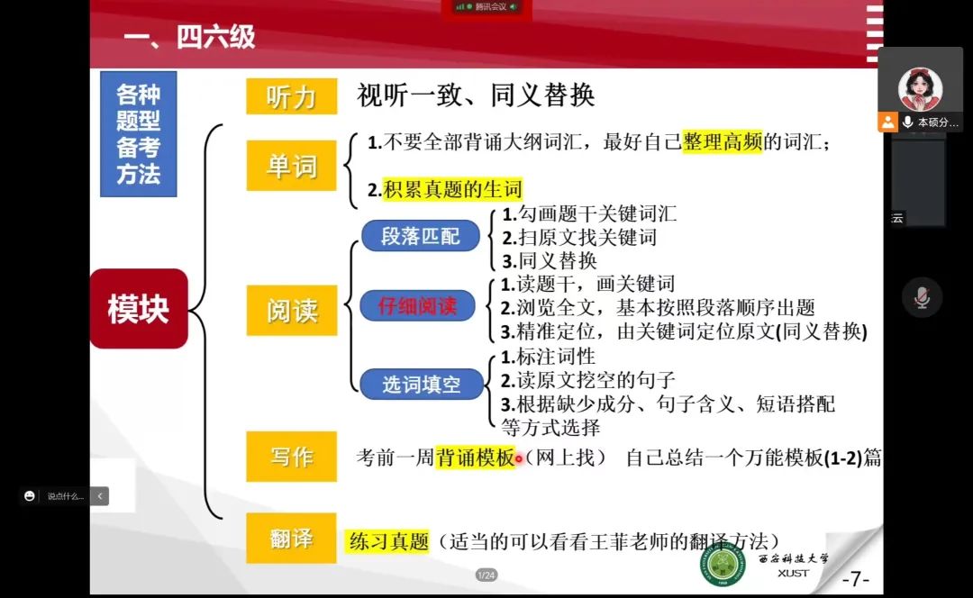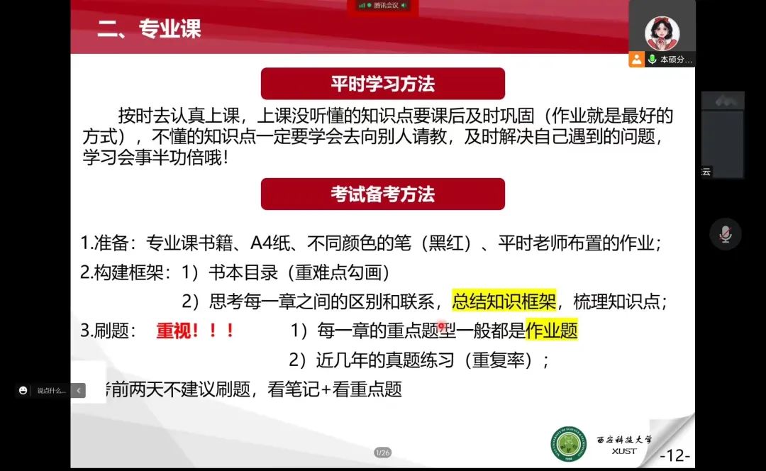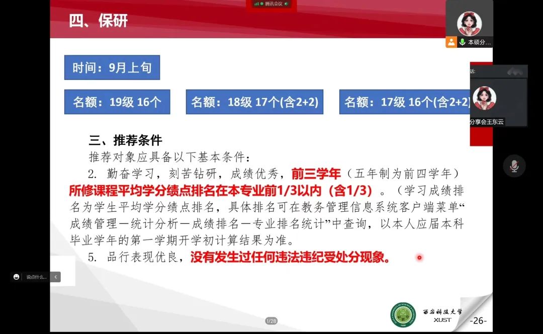 分享会上,两位保研至西安科技大学的优秀研究生分别从四六级、专业课、毕业设计和保研四个方面依次分享了自己的学习历程并给出各方面的学习建议。董佩佩从四六级的题型分析、学习安排和应试技巧三方面进行经验交流分享;然后对于专业课指出其对未来工作及考研、保研的重要性并为同学们提供了学习和备考方法。王东云就毕业设计的过程、内容及其重要性等方面进行介绍,同时鼓励同学们增加专业技能训练,提前为毕业设计做准备;其次结合个人保研经历,从公司推免名额、推免条件和考核细则详细的介绍了保研过程,并希望同学们要尽早做好规划,合理安排时间去做更多有意义的事。交流过程中,同学们纷纷表示,优秀研究生们分享的宝贵经验具有很好的借鉴意义,深受启发。