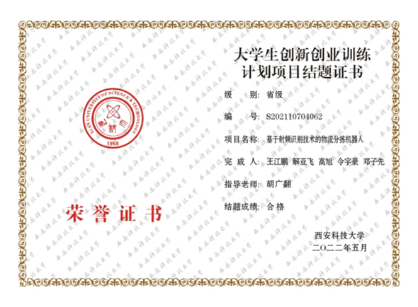 这次考核之后,我们三个人之间的了解和配合得到了加深和巩固,后来便一起组队参加了不少比赛,最有代表性的还要属老员工创新创业训练计划项目。我们的项目名称是《基于射频识别技术的物流分拣机器人》,要求是大一立项,大二结题的,中间有一年的准备时间。因为这是我们第一次独立尝试完成项目,参加大型的项目验收,在最初立项的时候每个人都信心满满,想要大干一场。可在大二刚开学,队长就因为疫情不能按时返校,一时之间大家都开始各自有各自的想法,那段时间项目几乎毫无进展。在中期答辩之后尝试申请专利时,因为申报人顺序问题,队友之间又吵了一架,项目似乎进行不下去了。大家都有些泄气。这时已经返校的队长提议大家聚在一起好好聊一聊,相互提提各自的问题与意见。期间每个人都推心置腹地说出了自己心中的想法,矛盾也就解开了。最终大家比以往更加凝成一股绳,一鼓作气在结题答辩之前顺利完成了项目。这些比赛的经历磨练了我们的意志,培养了我们的合作意识,让我们明白成功不是一蹴而就的,要克服种种困难才能到达成功的彼岸。