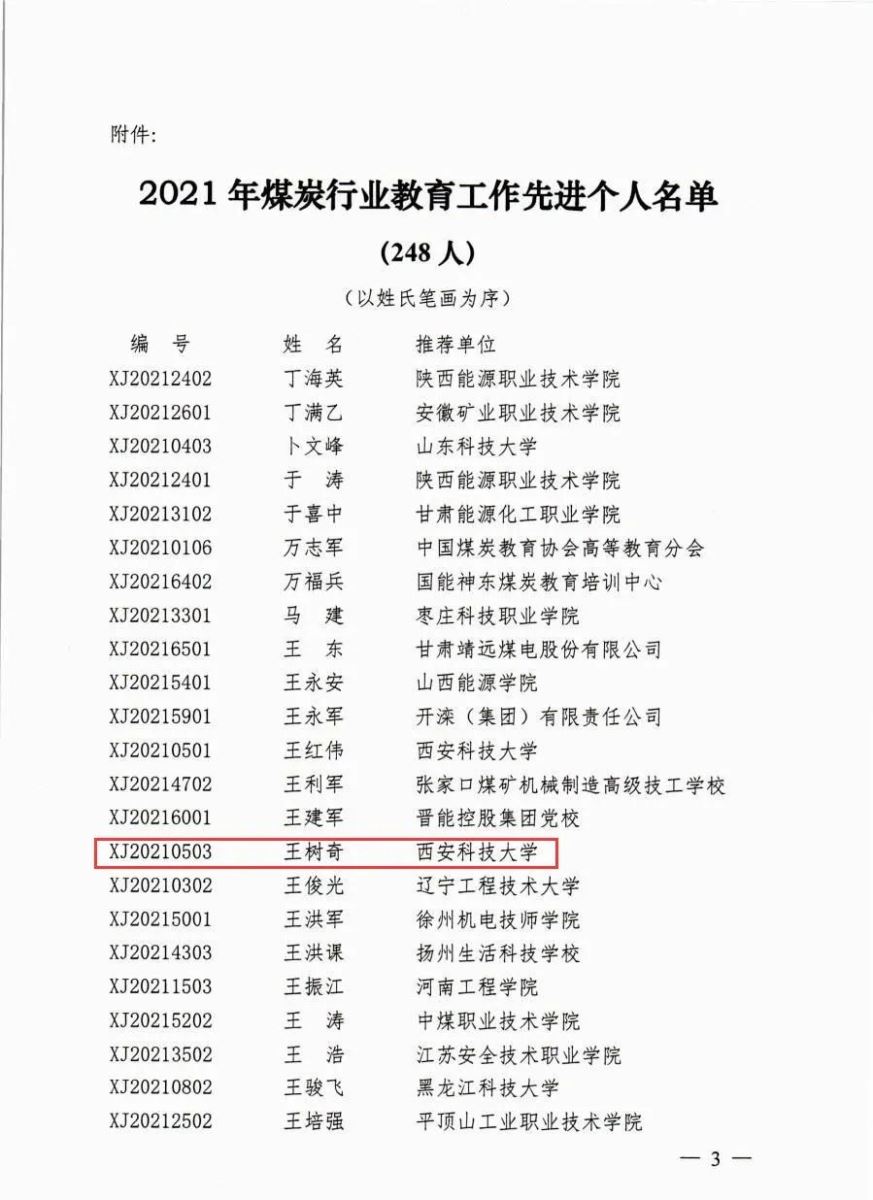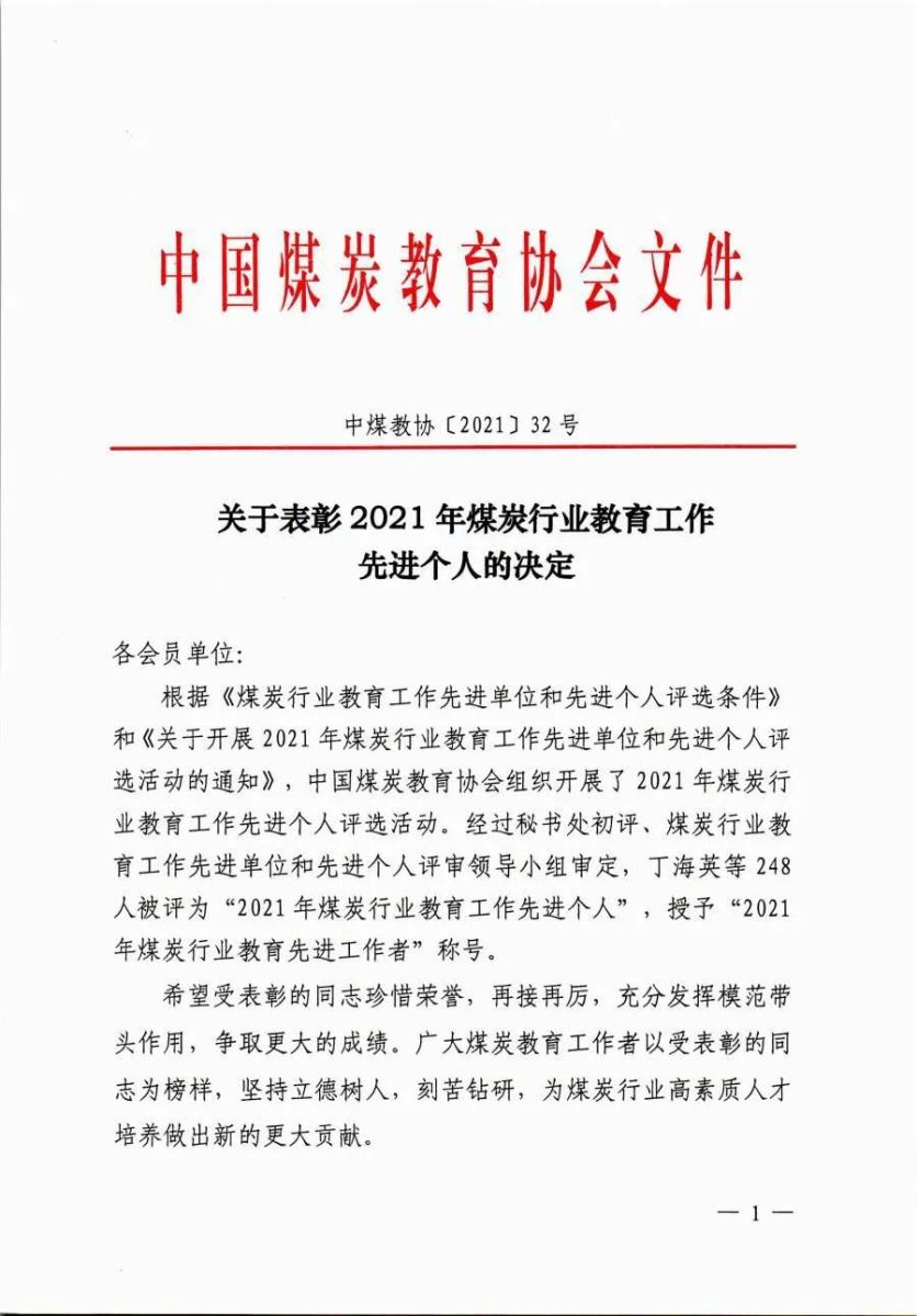 根据《煤炭行业教育工作先进单位和先进个人评选条件》和《关于开展2021年煤炭行业教育工作先进单位和先进个人评选活动的通知》,中国煤炭教育协会组织开展了2021年煤炭行业教育工作先进个人评选活动。经过秘书处初评、煤炭行业教育工作先进单位和先进个人评审领导小组审定,公司王树奇被评为“2021年煤炭行业教育工作先进个人”。