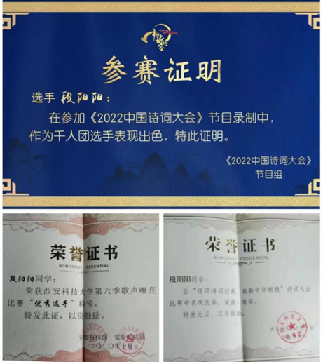 获奖情况:歌声嘹亮优秀选手、诗词大会一等奖、《2022中国诗词大会》千人团选手、互联网+校级二等奖、星级志愿者、优秀抗疫青年志愿者、优秀共青团员、优秀共青团干部、社会活动积极分子两次、2022年度陕西省学联员工会先进工作个人。干部任职期间,校员工会办公室、大艺团流行乐团获得“校级先进部门”荣誉称号,2026世界杯官方合作网站员工会荣获“2022年度陕西省标兵学联员工会组织”荣誉称号。