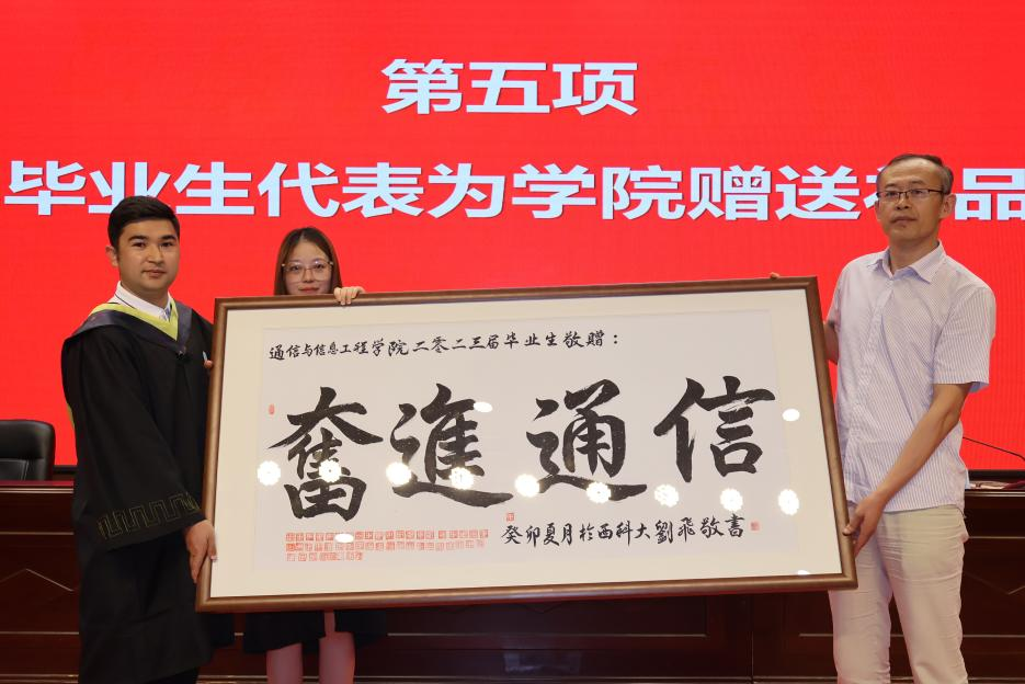 毕业生代表向公司赠送礼物——书法作品“奋进通信”,表达对母校教育培养的感恩之情以及对公司未来高质量发展的美好祝愿。