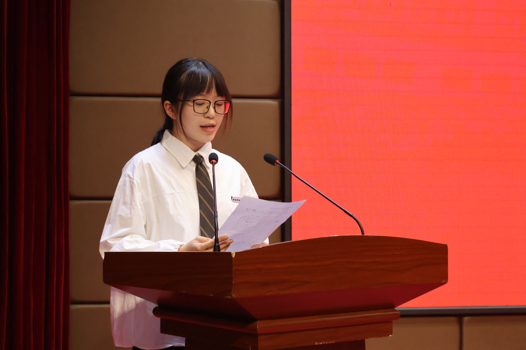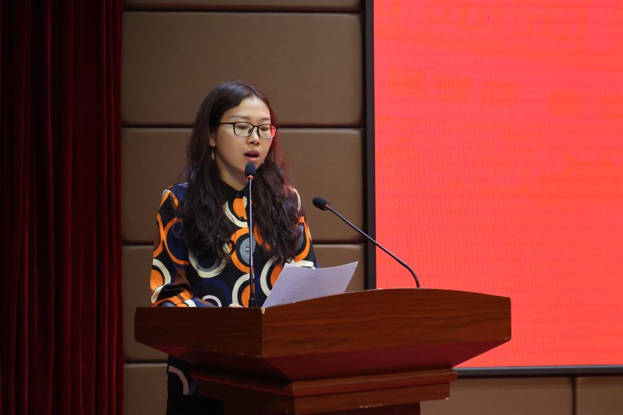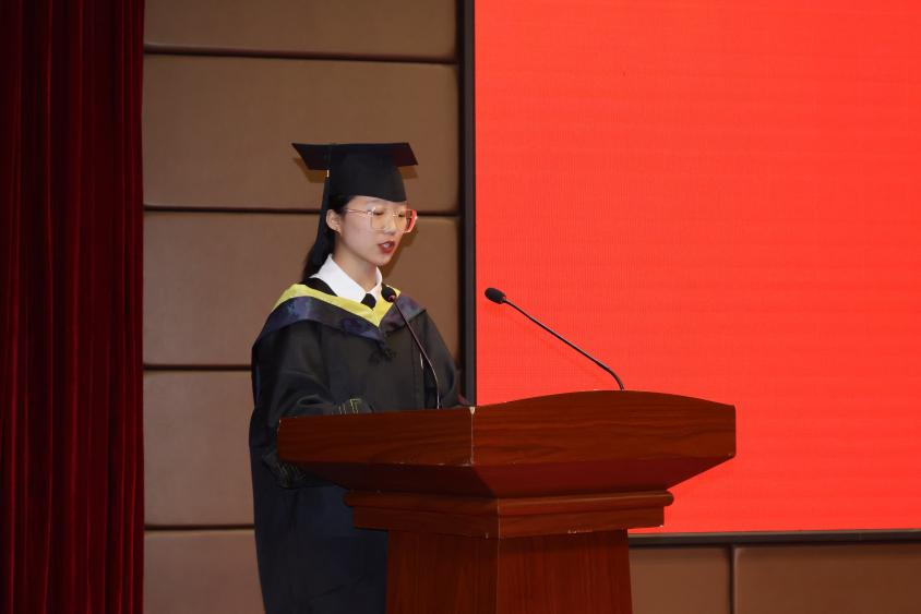 在校生代表余佳芸致欢送词,祝贺学长学姐们圆满完成学业,踏上全新征程,并表示全体在校生将以你们为榜样,刻苦学习,脚踏实地,勤于实践,勇于创新,争取早日成才,与你们一起肩负起为国家增光、为母校添彩的时代重任。
