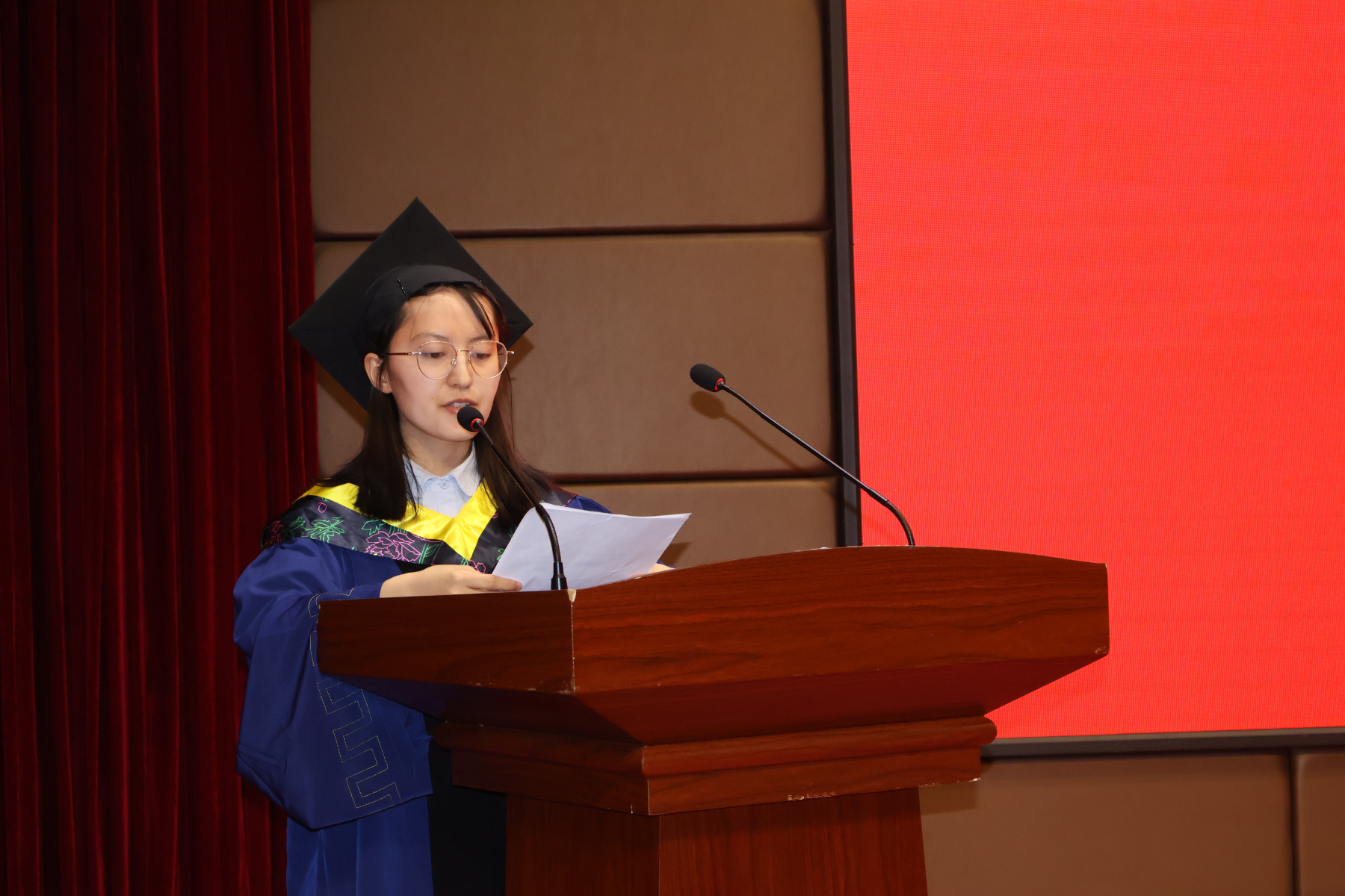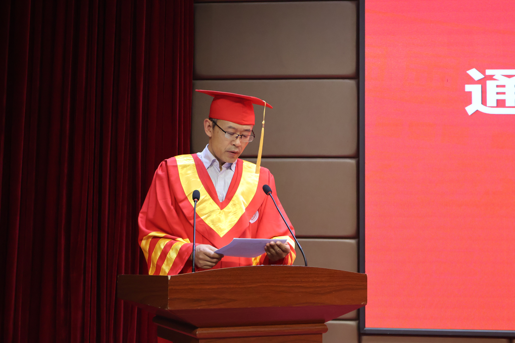 典礼在庄严的国歌声中拉开序幕。 副经理黄晓俊宣读学位授予决定、优秀毕业论文名单。