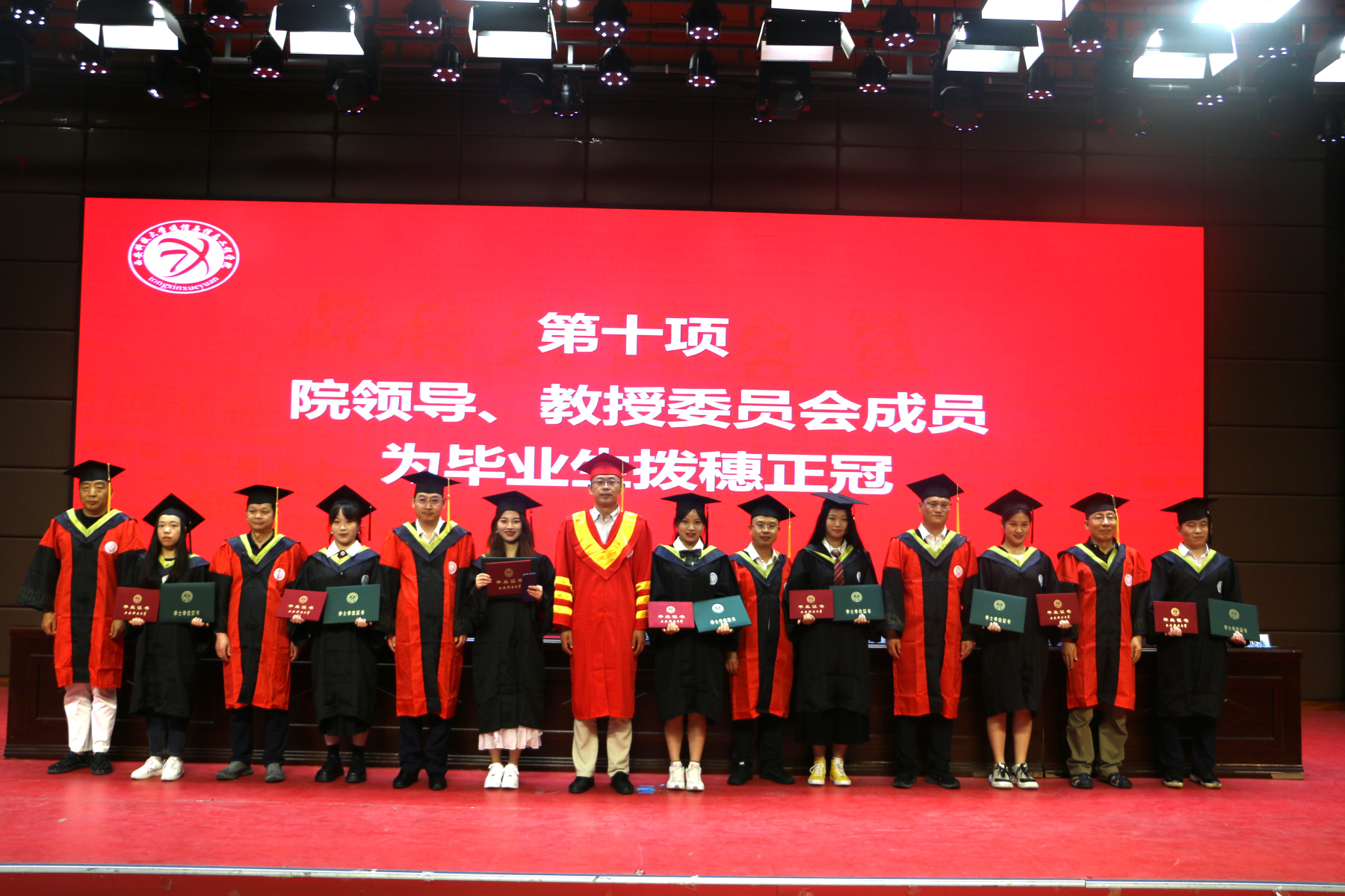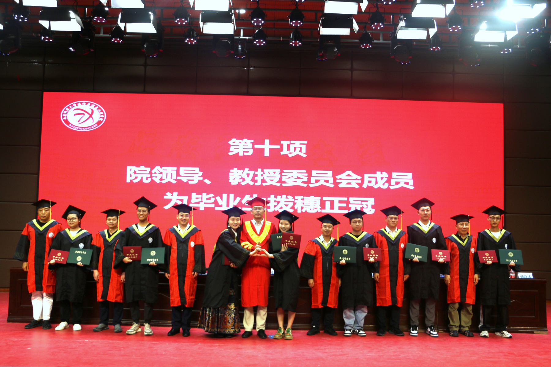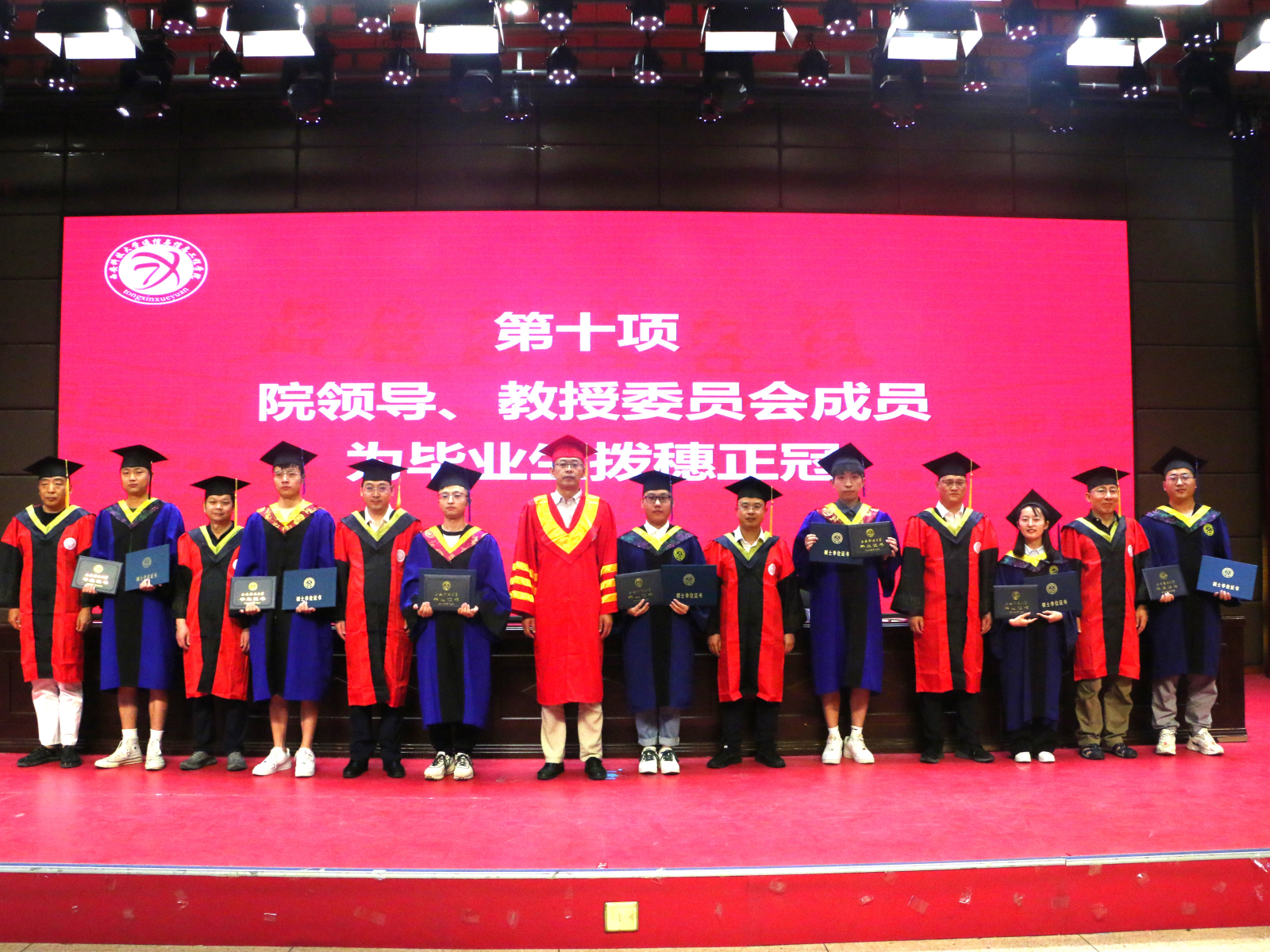 随后,与会院领导、教授委员会成员为全体毕业生拨穗正冠,颁发毕业证书、学位证书,并合影留念。