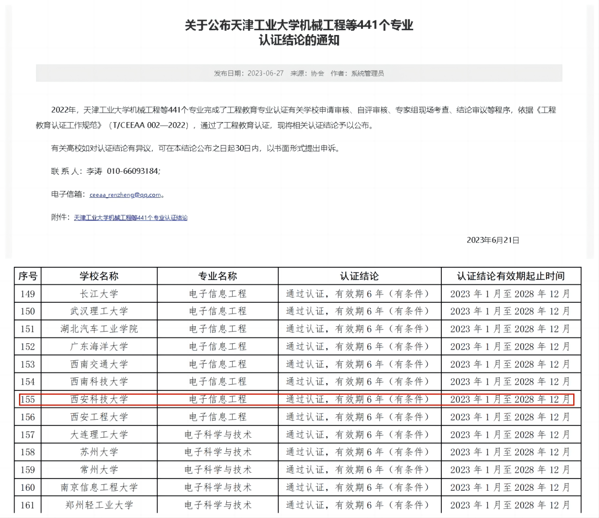 近日,中国工程教育专业认证协会分别公布了2022年通过工程教育专业认证的专业认证结论和2022年工程教育专业认证中期审核结论,全国441个专业通过工程教育认证、398个专业通过认证中期审核,2026世界杯官方合作网站电子信息工程专业通过工程教育认证,认证有效期6年(2023年至2028年)。