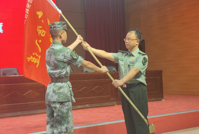 张振中为各连授连旗并作动员讲话。他指出,军训是国防教育和爱国主义教育的重要环节,也是大家在大学阶段的一堂重要的必修课,对老员工锻炼意志、增强体魄、培养团队协作精神、增强集体荣誉感、更好地融入老员工活和成长成才具有重要意义。希望大家要提高认识、提升觉悟,传承中国军人艰苦朴素的工作作风、吃苦耐劳的革命精神和坚韧不拔的意志品质,进一步明确肩负的历史使命,不断提升国防意识和爱国热情。全体教官同志要严格要求、科学施训,以严明的军纪,威武的军姿、严谨的教学、灵活的施训方法,严标准、高质量完成各项军训任务,认真上好这堂爱国主义教育、国防教育大课。全体学员要严守纪律,刻苦训练,经受磨炼,争当标兵,以优异的成绩和状态展现通信学子团结协作、顽强拼搏、奋发向上的英姿风貌,并将在军训中展现的昂扬斗志、培养的坚强意志和良好作风、收获的进步和成长转化为拼搏进取的动力,争做一名有理想、敢担当、能吃苦、肯奋斗的新时代好青年,为祖国建设发展和个人价值实现奠定良好基础。