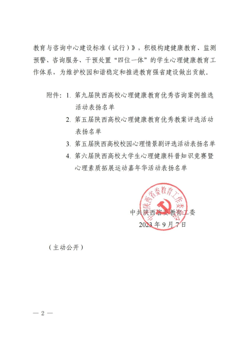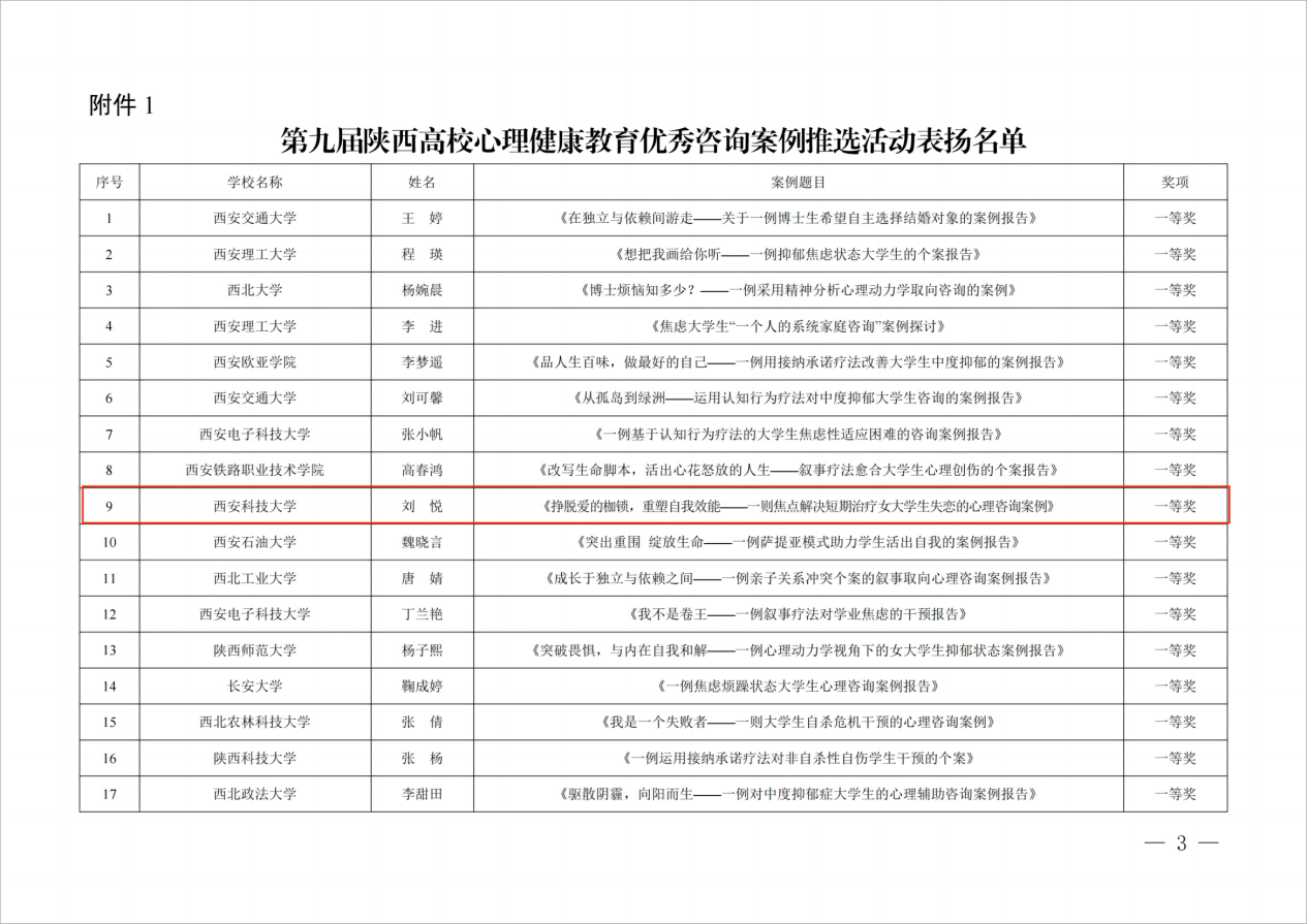 近日,中共陕西省委教育工委公布了第八届陕西高校“阳光护航”心理育人宣传季省级实践活动获奖名单,经过资格审核,校赛推荐、省赛选拔,公司学工干部刘悦所撰写心理咨询案例《挣脱爱的枷锁,重塑自我效能——一则焦点解决短期治疗女老员工失恋的心理咨询案例》获评一等奖(全省高校共18项)。