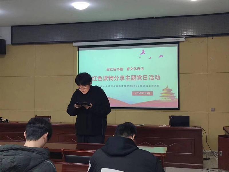 习近平总书记在致首届全民阅读大会的贺信中提出,“希望全社会都参与到阅读中来,形成爱读书、读好书、善读书的浓厚氛围。”为走进历史、了解历史,从红色故事中汲取精神力量。12月3日晚,2023级研究生党支部在16教323会议室举办了“阅红色书籍 育文化自信”红色读物分享主题党日活动,本次活动由第二党小组主持。各党小组党员代表分别分享阅读过的一本红色书籍,介绍其写作背景和具体情节等相关内容,畅谈自己的理解和心得体会。
