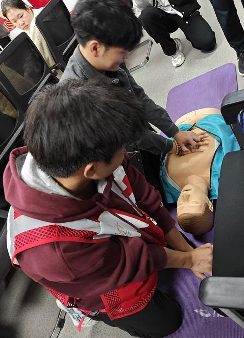 期间,应急知识宣讲团成员结合自身经历,深入浅出地讲解心肺复苏、止血包扎等应急救护理论知识,辅以生动的案例分析,让理论知识变得生动有趣。现场进行情景模拟,由经验丰富的宣讲团成员手把手指导,确保每位同学都能在模拟人上进行完整的CPR操作,掌握按压深度、频率等关键要素。同时演示不同伤口的包扎方法,包括绷带、三角巾的正确使用,随后同学们在志愿者指导下,两两一组进行实操练习,确保操作规范。经过现场训练,参与者反馈自身在心肺复苏和止血包扎的技能有了显著提升,理论知识掌握度提升。