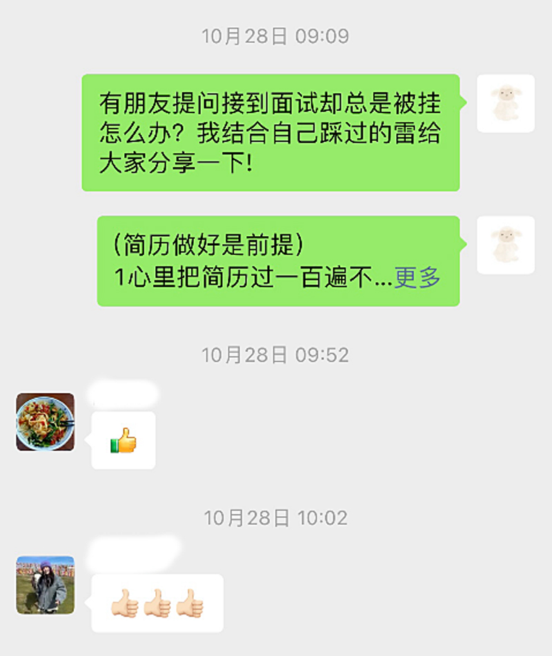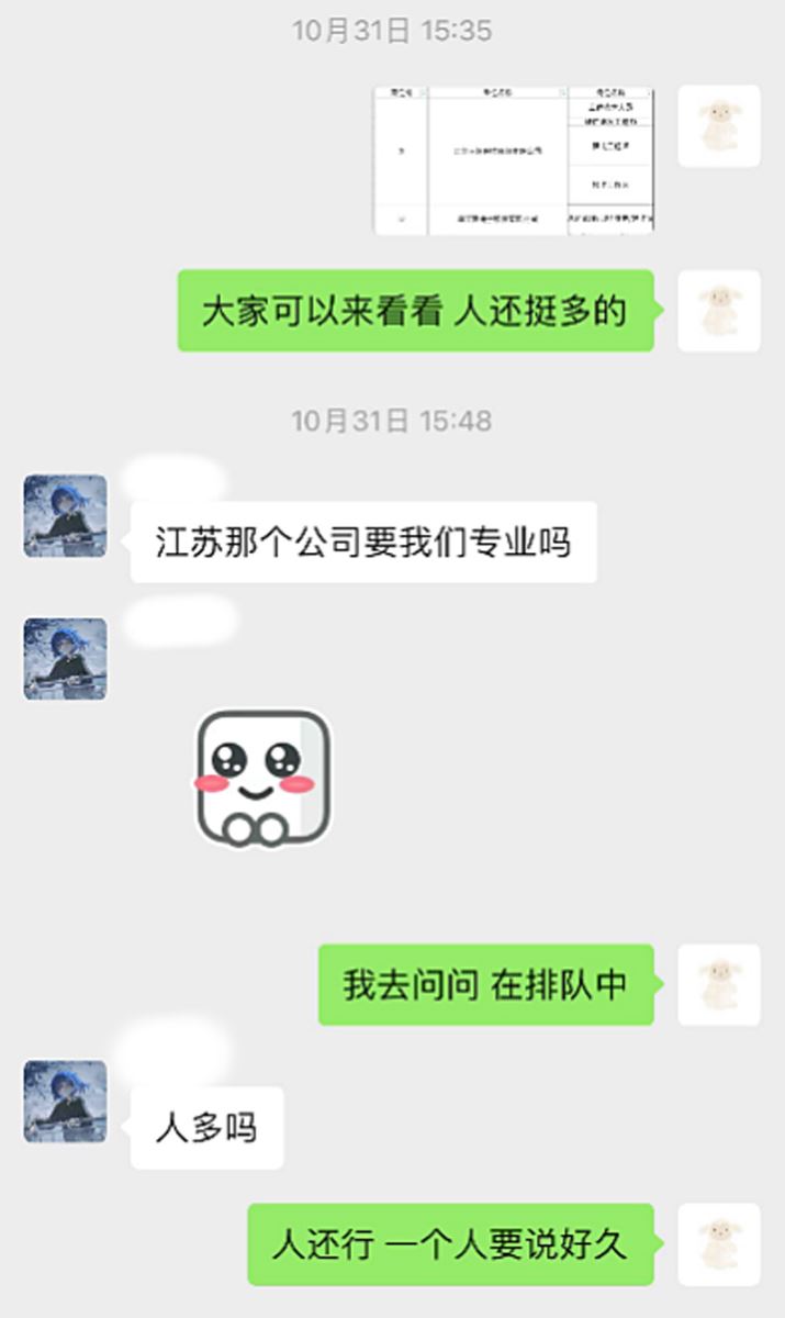 准备考研的同学如果能在考研前收到Offer,心中会更有底气。我不断关注各大公司的招聘机会,分享宣讲会信息,带来他们感兴趣企业的宣传册,遇到合适的公司会帮助他们代投简历。在我的帮助下,他们收到一些公司的面试邀请。这让他们也能关注职场机会,为自己规划更好的未来。