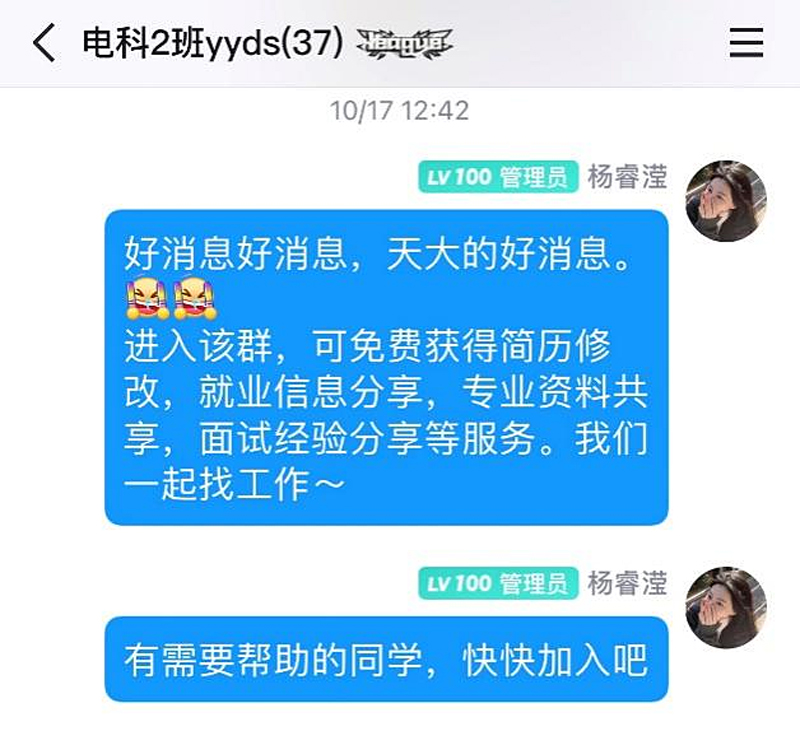 在签约之后,考虑到我们班还有几名同学依旧在求职中,我充分发挥党员先锋模范作用,在班级内建立求职互助群,分享就业信息,共同交流讨论,了解班级同学的实际情况和需求,希望能够帮助同学以积极乐观的心态应对就业挑战,带动更多的同学顺利拿到Offer。