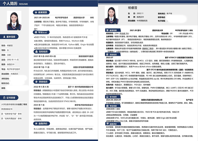 经过不断地学习完善,我把简历里较为普通的绩点改成比较优秀的专业课成绩;把含金量较高的荣誉下画线重点突出;项目/实习经历分点描述,以时间+项目/企业+担任职位+工作任务+具体量化的事情+所获得的成果展示;列出与岗位相关的软、硬件技能、语言技能,不同的岗位有不同的侧重点,具体说明能用该技能做的事;检查简历无误后,将简历转为PDF格式并规范命名。简历需要经常修改,不能一成不变,投递不同的岗位要使用针对性的内容。