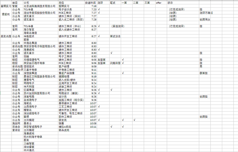 投递简历我强推这两种方式:参加专场招聘会,这不仅可以更了解公司情况,有时会有直接面试的机会,进程更快;关注专业群聊消息,招聘信息部分有老师的内推,简历由老师邮件打包超级高效。然而公司组织的校招往往只占整个秋招行程中的一部分,大部分的机会都是需要自己去外部拓展的,我们还需要关注外校宣讲会、秋招相关公众号,意向公司的官网,下载前程无忧、智联等求职类APP。另外,可以通过企查查、天眼查来查询企业信息,避免求职于非正规单位。通过Offer Show小程序查询企业薪资。投递之后可以在Excel做个简单的投递记录,方便后续查询进度。