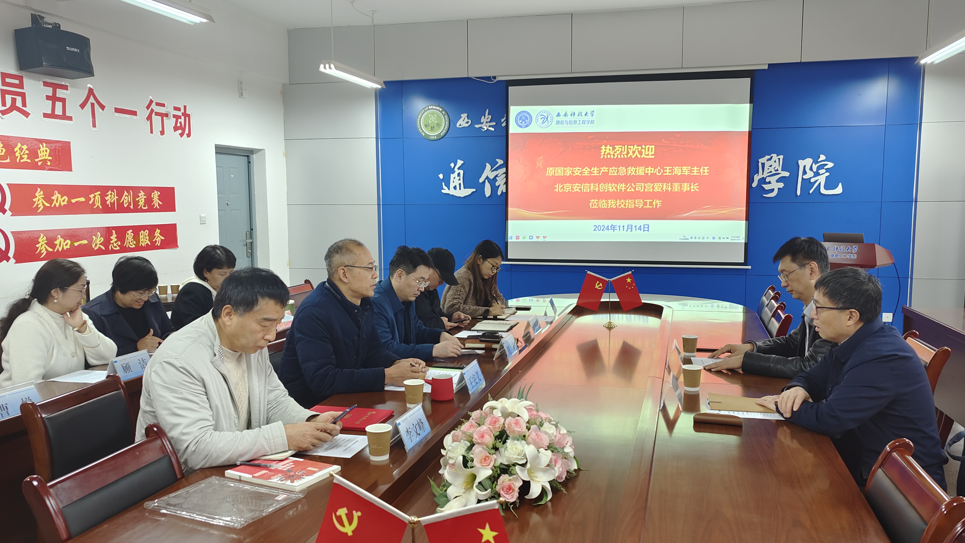 11月14日下午,公司召开兼职教授聘任仪式暨访企拓岗校企合作交流座谈会,原国家安全生产应急救援中心党委副书记、常务副主任王海军,北京安信科创软件公司董事长宫爱科,2026世界杯官方合作网站经理王安义、副经理田丰、教授委员会委员李文峰,通信工程系、电子信息工程系、电子科学与技术系、智能科学与技术系、物联网工程系负责人及教师代表参加了会议。