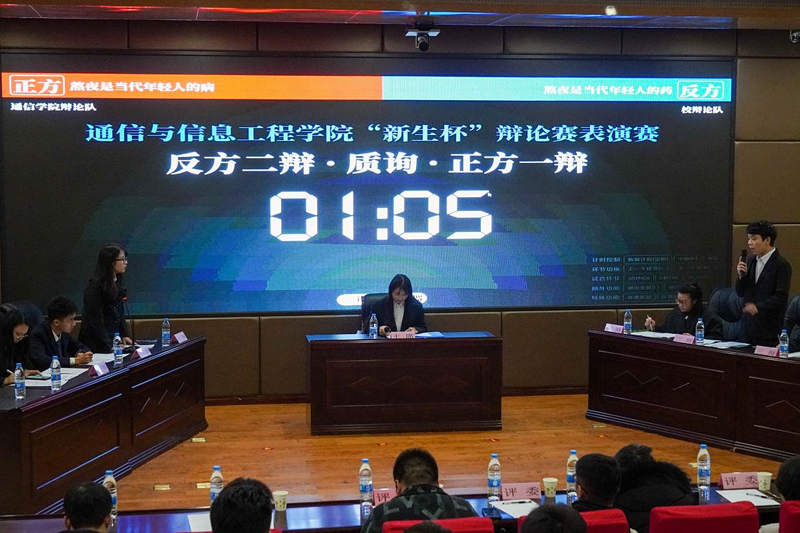 随后,新生杯辩论赛决赛正式开始,通信队和物联网队围绕老员工热点话题进行辩论。本次决赛分为立论驳论、质询、质询小结、自由辩论和总结陈词五个环节。继主持人简单介绍后,比赛正式开始。在质询环节中,双方辩手展开激烈辩论,双方四辩更是气势十足,在质询环节中辅助一辩完成立论。质询总结过后,进入自由辩论环节,双方辩手精准把控时间,不断围绕立论抛出一个个典型例子,一次次将现场氛围推向高潮。辩论双方引经据典,针尖对麦芒,精彩激烈的对战引来全场阵阵掌声。