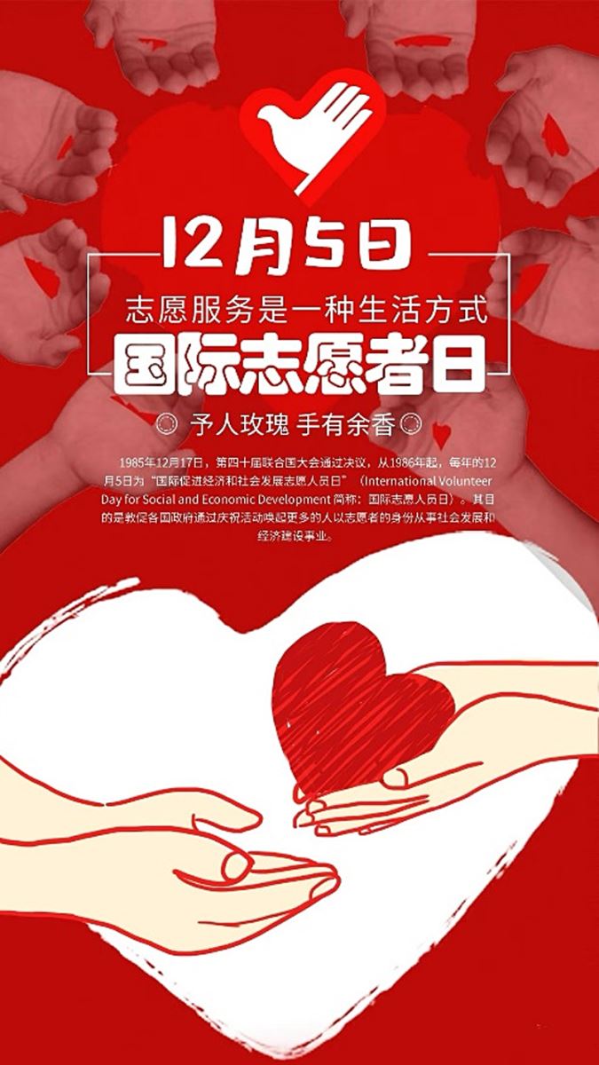国际志愿者日(International Volunteer Day)是为了纪念和推进志愿服务事业而设定的日子。这个节日起源于第二次世界大战之后的重建工作,各国志愿者开始参与义务服务,他们在重新建设家园、推动经济发展以及促进社会文明进步方面都起到了关键的作用。为了进一步鼓励这种行为,1985年的联合国第40届代表大会通过了决议,自1986年起将每年的12月5日设定为“国际志愿者日”。
