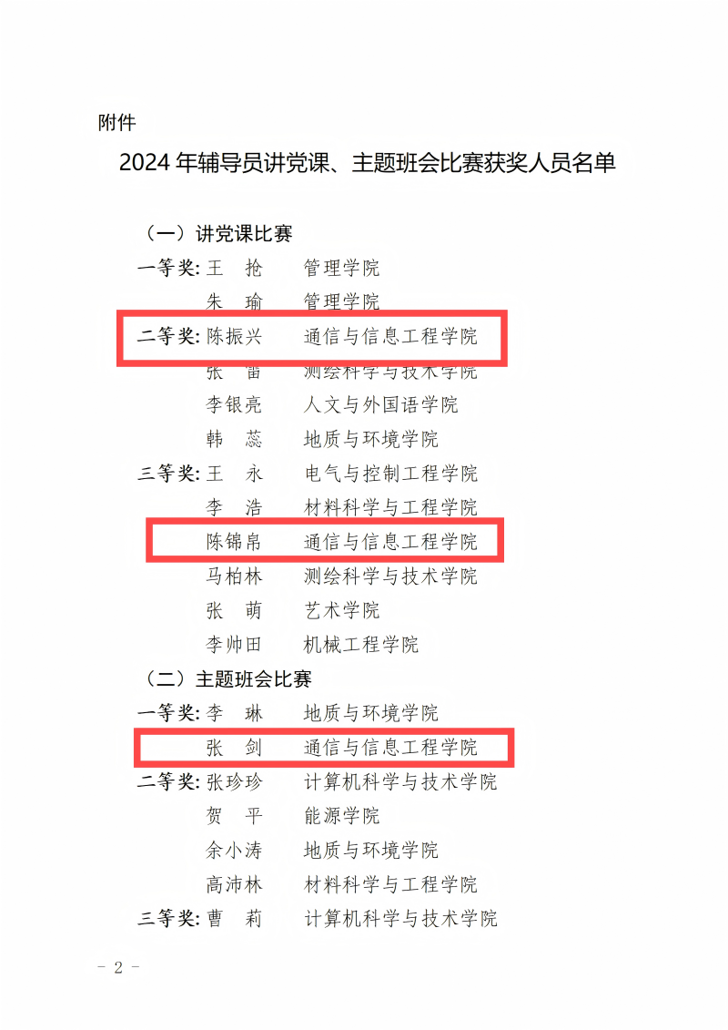 根据《2024年辅导员讲党课、主题班会比赛结果的通知》公司辅导员张剑获主题班会比赛一等奖,辅导员陈振兴获主题党课比赛二等奖,辅导员陈锦帛获主题党课比赛三等奖。