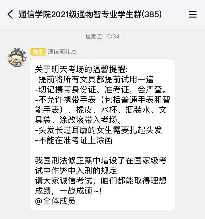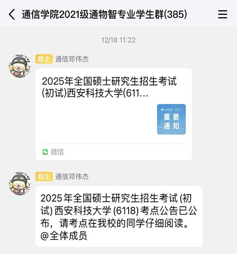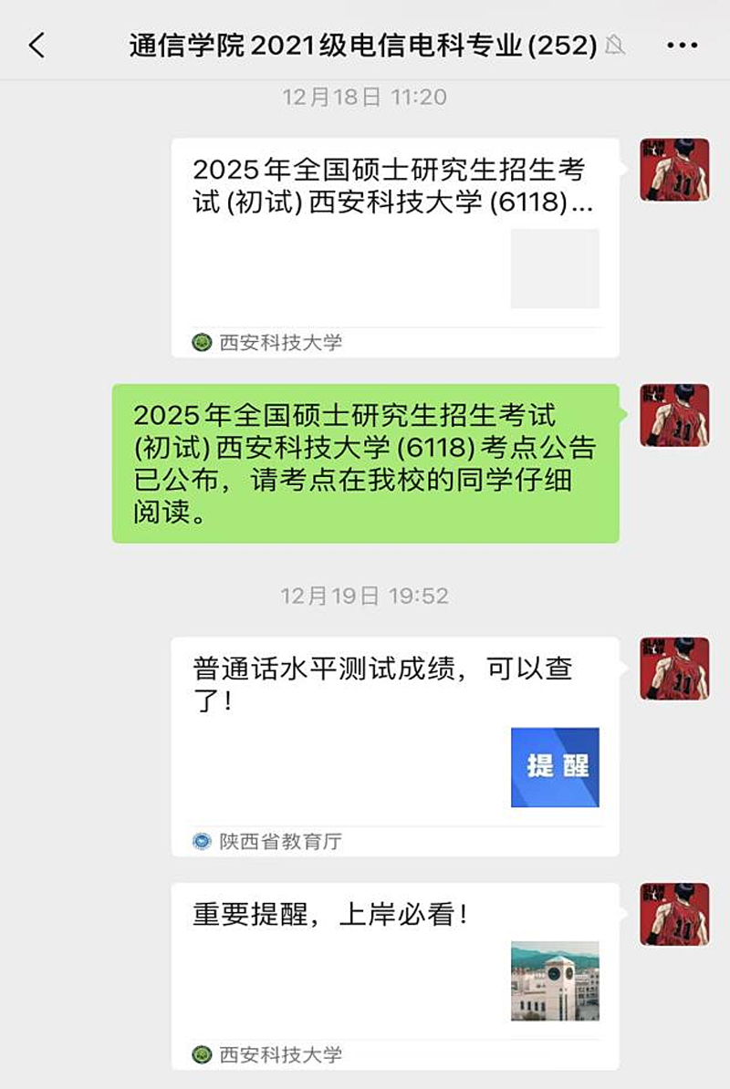 辅导员温馨提醒、全程陪伴。2021级本科生辅导员刘悦、邓伟杰在考前分享考前经验,事无巨细的提醒考生提前熟悉考场环境、注意饮食作息,备齐证件物品、及时调整心态、一定坚持到底,提供缓解压力的有效方法,帮助同学们以最佳状态迎接考试。同时开展了“诚信研考”教育活动,强调诚信考试的重要性。两位老师在全国硕士研究生招生考试的两天时间里全程驻守临潼校区陪伴考研员工,做好考研保障工作。