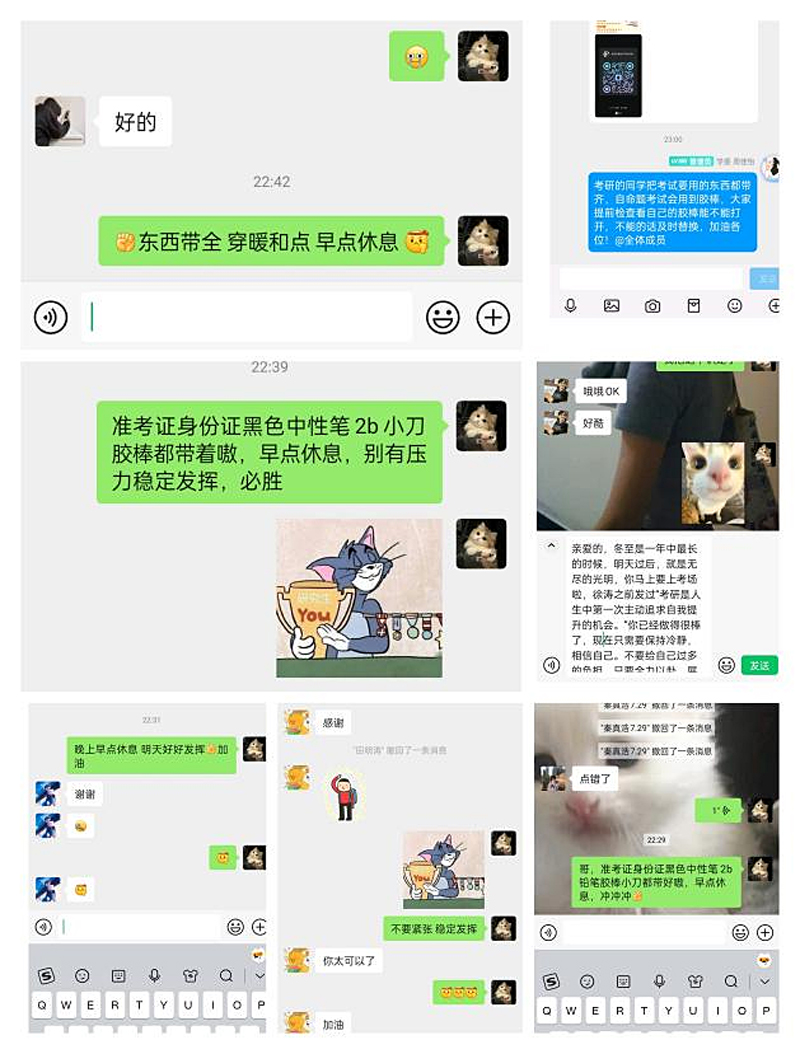 支部党员暖心护考、志愿相伴。硕士研究生招生考试期间,2021级本科生第一、第二党支部全体党员充分发挥先锋模范作用,为宿舍、班级的考研同学提供一些力所能及的志愿服务。这些服务包括但不限于在考试期间叫醒服务、物品保管、代买饭菜等服务,以及送上温暖祝福和贴心建议。帮助考研同学能够以最佳的状态全身心地投入到复习备考中。