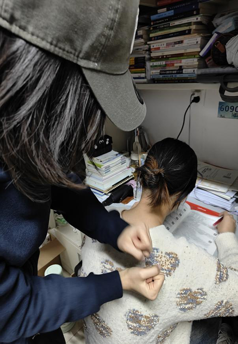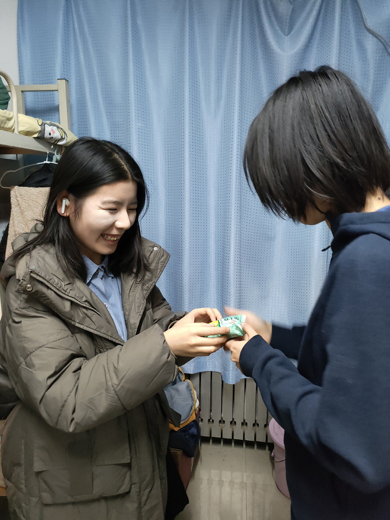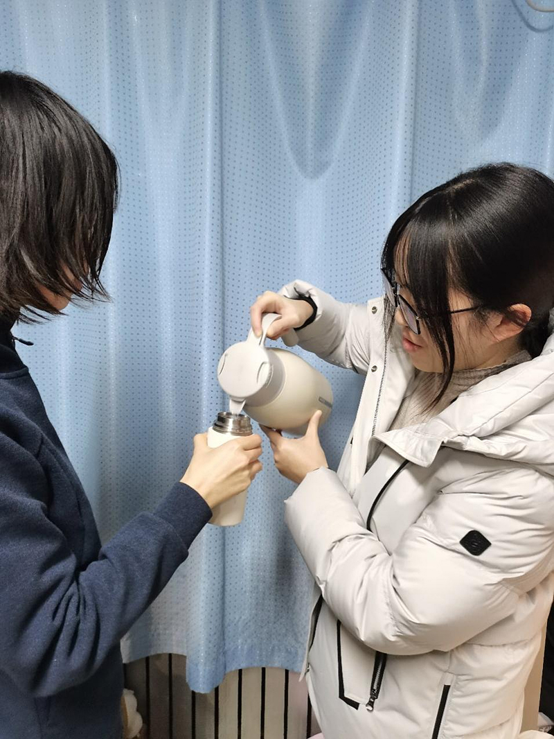 支部党员余佳芸:考研第一天,舍友一整天精神高度集中,又在图书馆学到很晚才回到宿舍,于是我提前打好热水,让她们在回到宿舍这个小家庭的第一时间就能喝到热水。希望这样一个小小的举动能够缓解舍友们一天的疲劳,即使在寒冷的冬天也能感觉到宿舍的温暖和舍友对她们的鼓励,相信披星戴月走过的路,终将会开花结果!