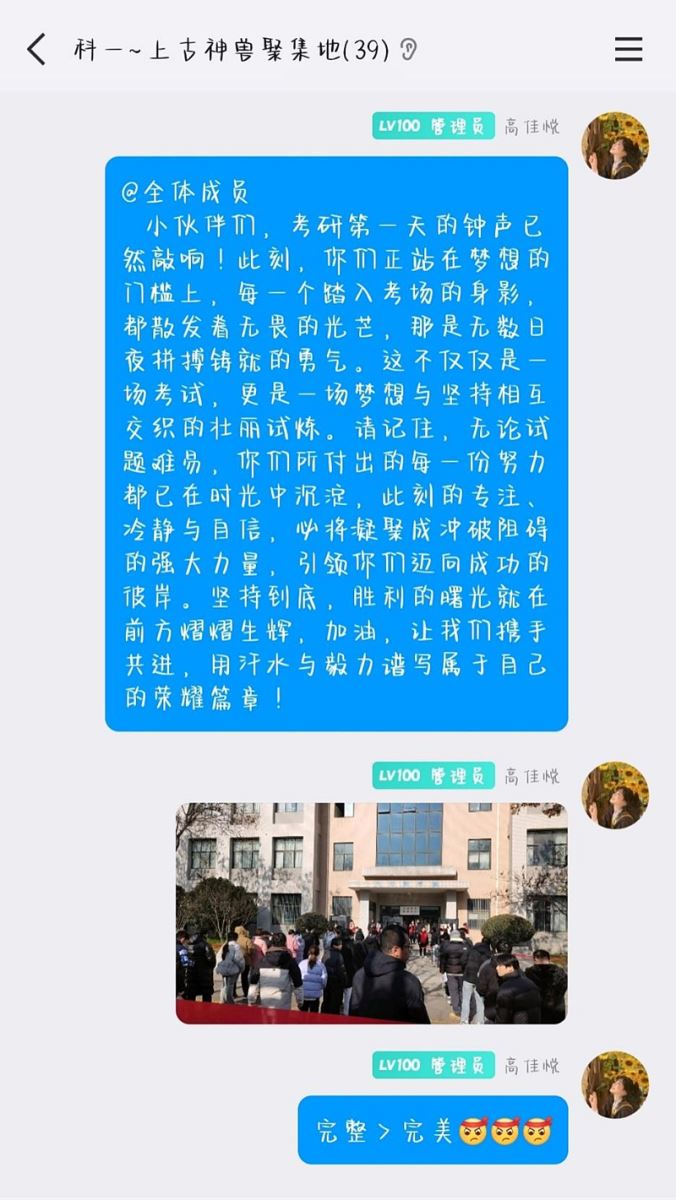 支部党员高佳悦:作为团支书,同时也是考研队伍的一员,我见过早上六点的校园,也见过晚上十点的月亮。考研这场个人战因为小伙伴的互相鼓励我坚持了下来,到现在结果如何已然不是最重要的因素,希望大家一起勇敢且坚定的给自己这段经历画上完美的感叹号!走完这条路的我们就是最棒的!完整>完美