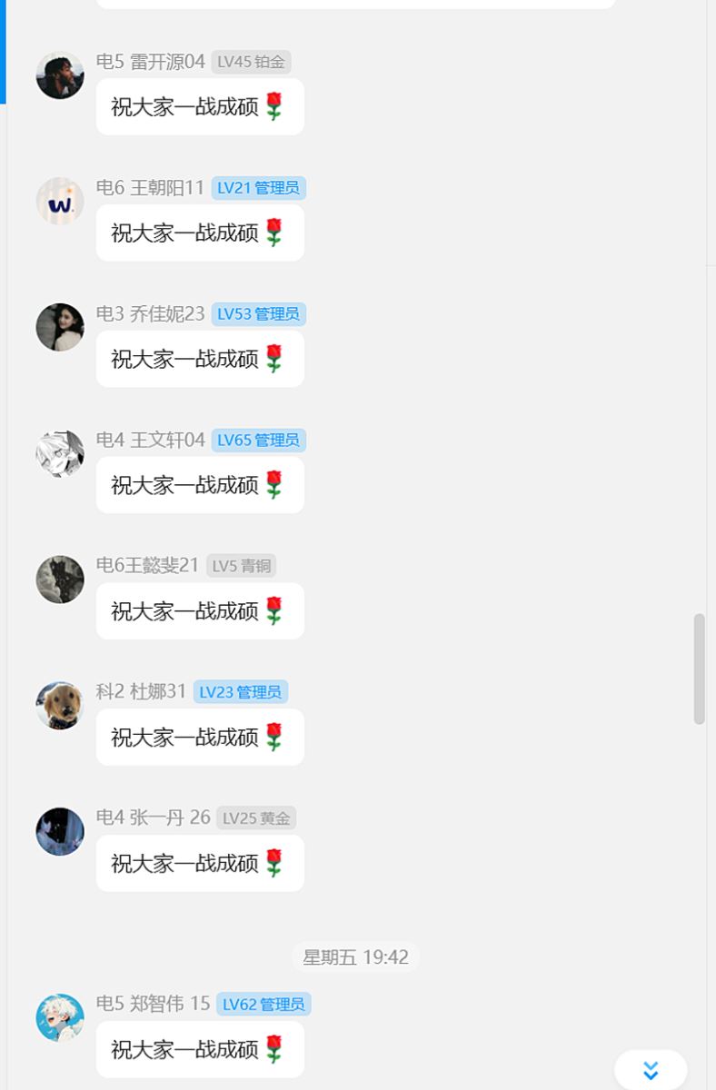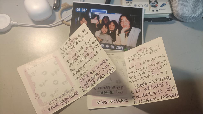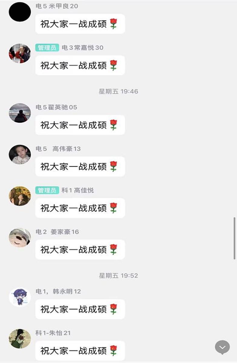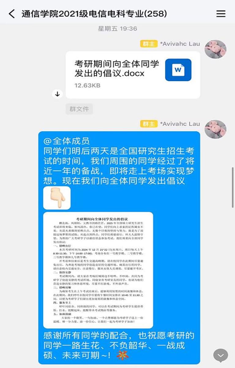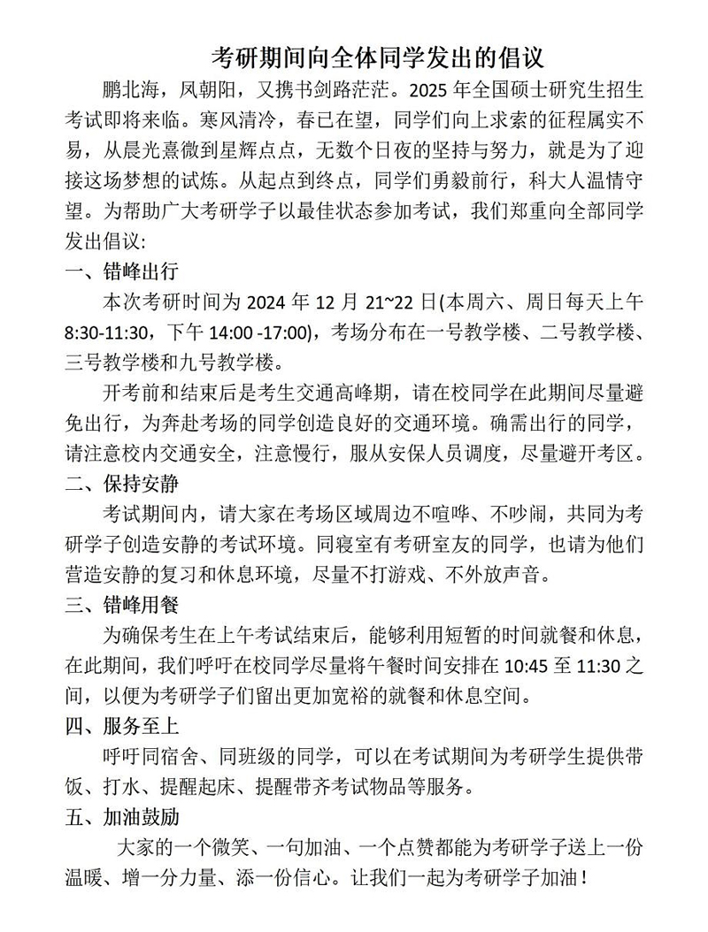 全体同学响应倡议、凝心聚力。为给考研同学创造安静、舒适、轻松的考试环境,助力他们梦想成真。向全体2021级员工发出倡议,在考研期间错峰出行、错峰用餐、在宿舍和公共区域内保持安静,为考研舍友提供起床叫醒、打水、带饭,提醒备齐考试物品等服务。全体同学积极响应,有一份光发一份热,所有的暖心祝福和一份力所能及的服务,化为考生驶向成功彼岸的“助燃剂”。