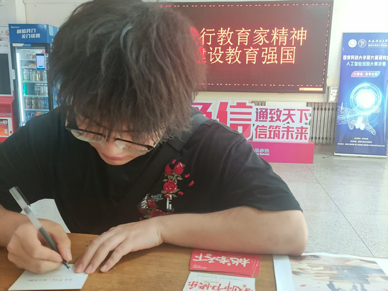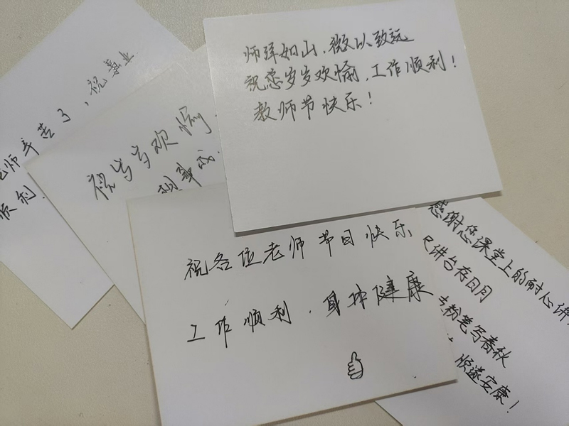 9月10日早公司在一楼大厅LED屏幕滚动显示“弘扬践行教育家精神,加快建设教育强国”“老师,您辛苦了!”“教师节快乐!”字幕,在公司官网对2025年公司师德先进、优秀教师风采进行了展示,营造出浓厚的尊师重教氛围,增强了教师的职业荣誉感和归属感。9月8日至9日,公司在一楼大厅举办"手写祝福传师恩"贺卡赠送活动。百余名员工踊跃参与,用精心书写的贺卡表达对老师的感恩之情。"感谢您课堂上的耐心讲解""愿您桃李满天下"......一句句真挚的祝福让贺卡成为承载师生情谊的珍贵载体。教师节当天,员工们将这份特殊礼物送达老师手中,温馨场面令人动容。