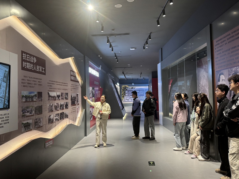 活动当天,参与师生在展馆入口处有序集合,随后在展馆专业讲解员的引导下,开启了军工科技文化之旅。步入展馆,“中国军工文化科技主题馆”的醒目标识瞬间点燃了大家的参观热情。讲解员以时间为轴,从抗日战争时期人民军工的艰辛起步讲起,详细介绍了闽北兵工厂、鄂豫皖兵工厂、官田兵工厂等革命根据地兵工厂的创建历程,在物资匮乏、条件艰苦的年代,革命先辈们凭借坚定的理想信念,自力更生、艰苦奋斗,为革命战争的胜利提供了重要物资保障,这段峥嵘岁月让在场每一位同学深受触动,深刻体会到“红色军工”的精神根基。